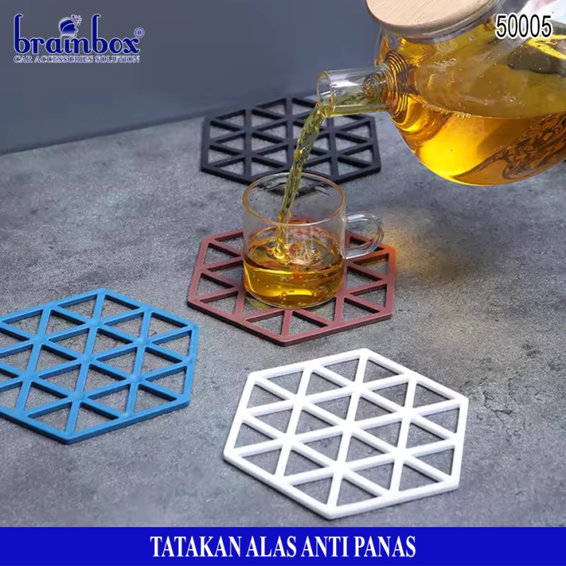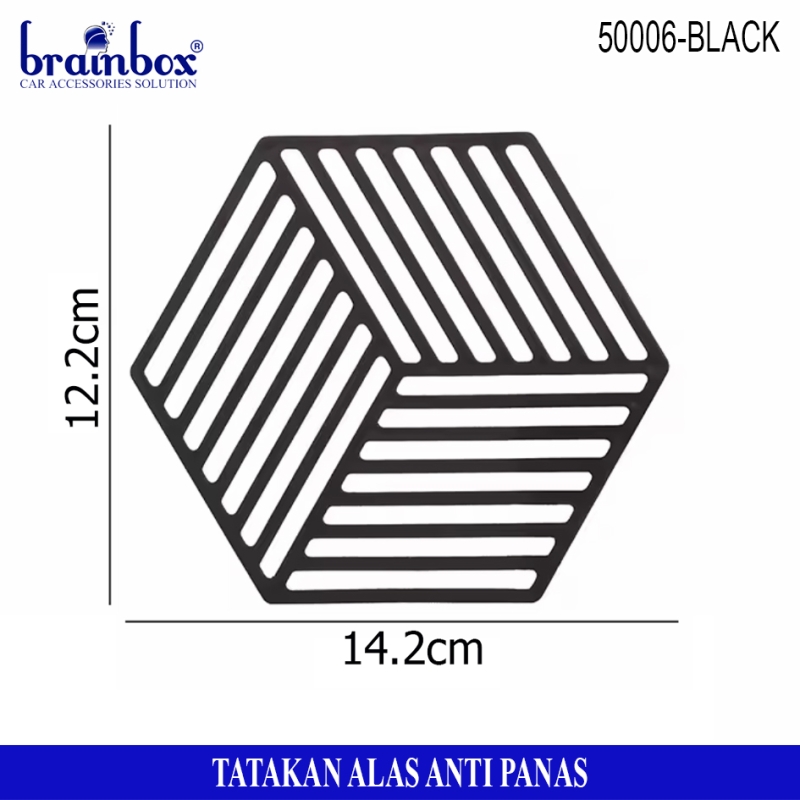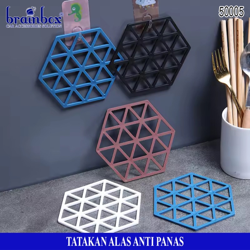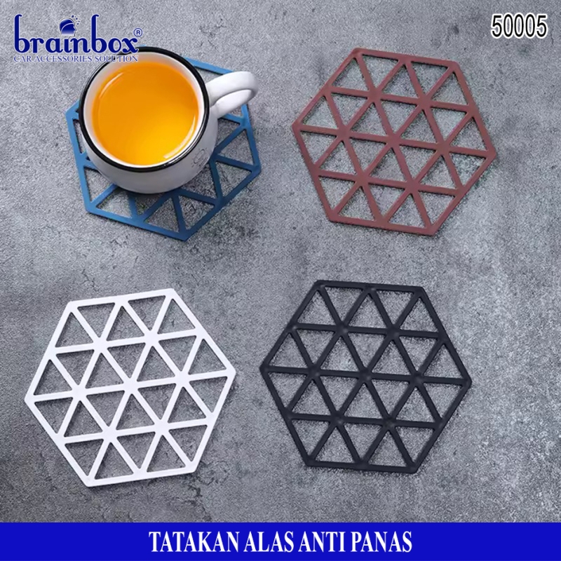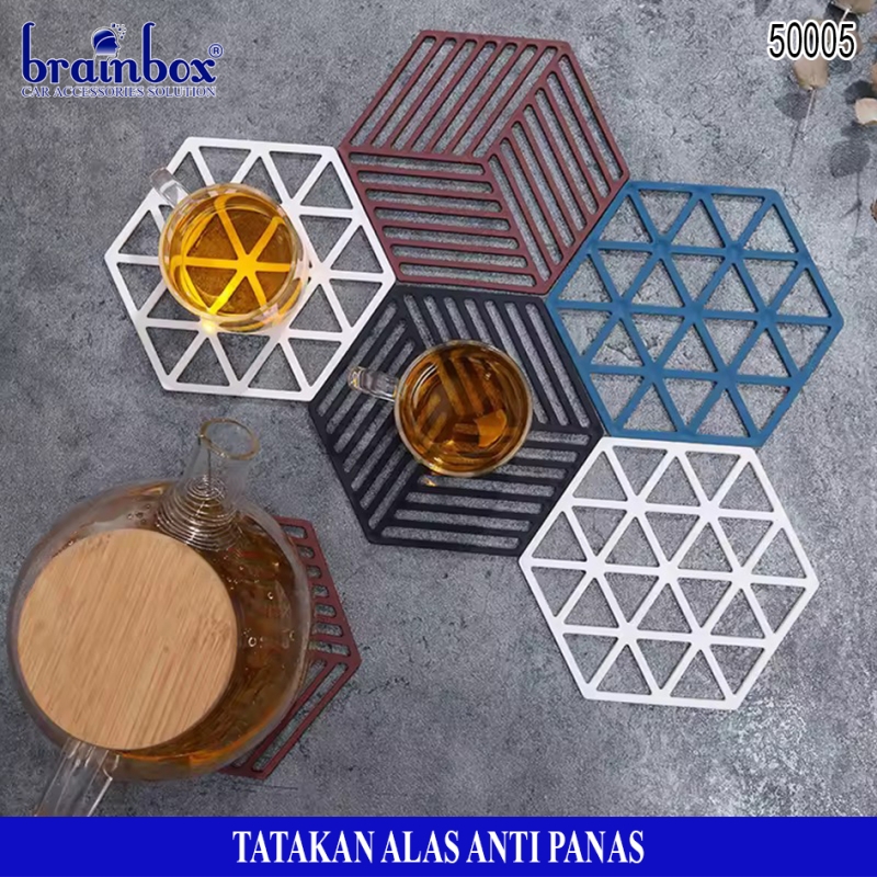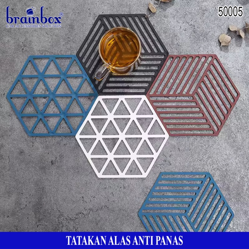 - Tatakan alas piring / gelas / panci berbahan anti panas yang memiliki bentuk hexagonal dengan motif garis dan segitiga yang dapat berguna untuk tatakan alas piring gelas maupun peralatan rumah tangga lainnya dengan desain yang lucu dan unik.