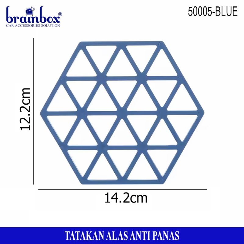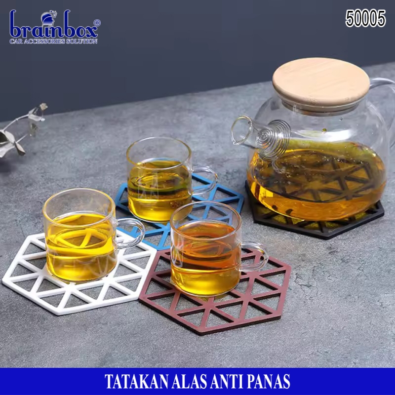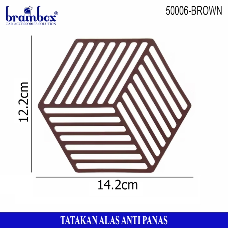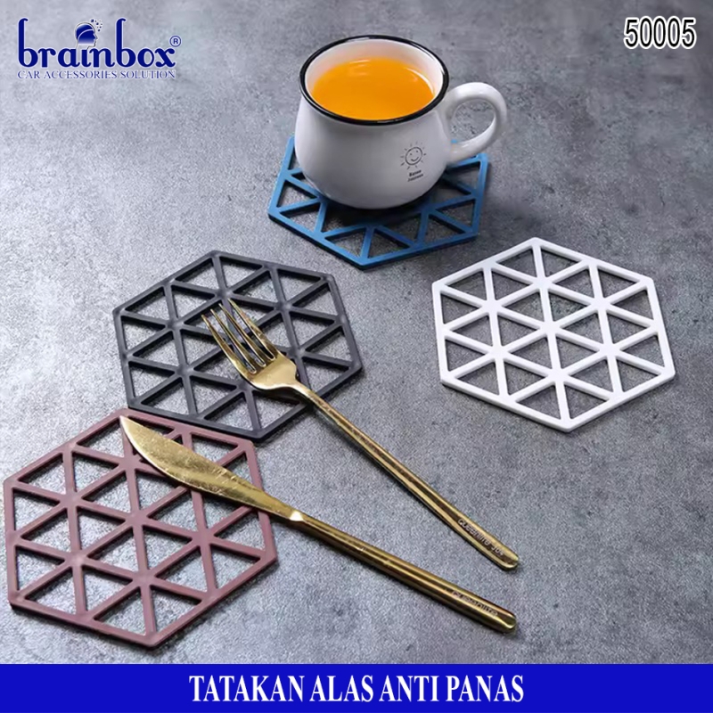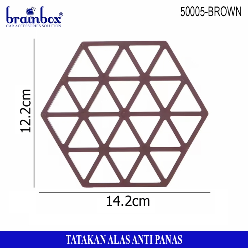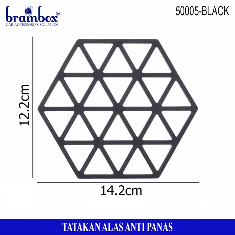 - Tatakan alas piring / gelas / panci berbahan anti panas yang memiliki bentuk hexagonal dengan motif garis dan segitiga yang dapat berguna untuk tatakan alas piring gelas maupun peralatan rumah tangga lainnya dengan desain yang lucu dan unik.